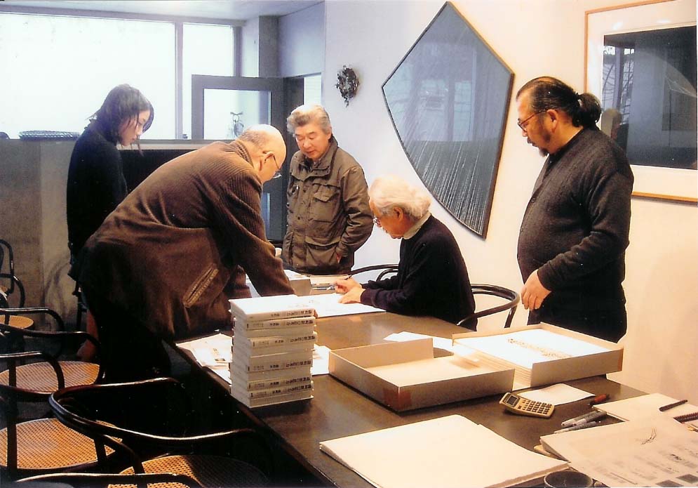 掲載した写真は某月某日、磯崎新アトリエでの打ち合わせ風景。左から尾立麗子、画廊亭主、植田実、磯崎新、刷り師の白井四子男。