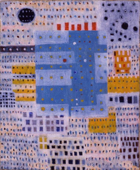 ある作品がある。油彩。街並を思わせる、縦と横の重なりあい。縦横に走る道路やビルや窓の一つ一つを、照らしているかのような窓が、中央に配置されている。いや、それは窓のようでもあり、窓を象徴する長方形のようでもあり、色の配置だけのようにも見える。世界を照らし出す長方形の淡い水色が浮かび上がった部分を、窓、と呼ぶことにしよう。日の光のきらきらした反射や、人の焚く火や、街にともる灯や、今ならパソコンのモニターや、充電器の合図の灯や、そういった世界のすべてを映し、世界のすべてに向かう窓。