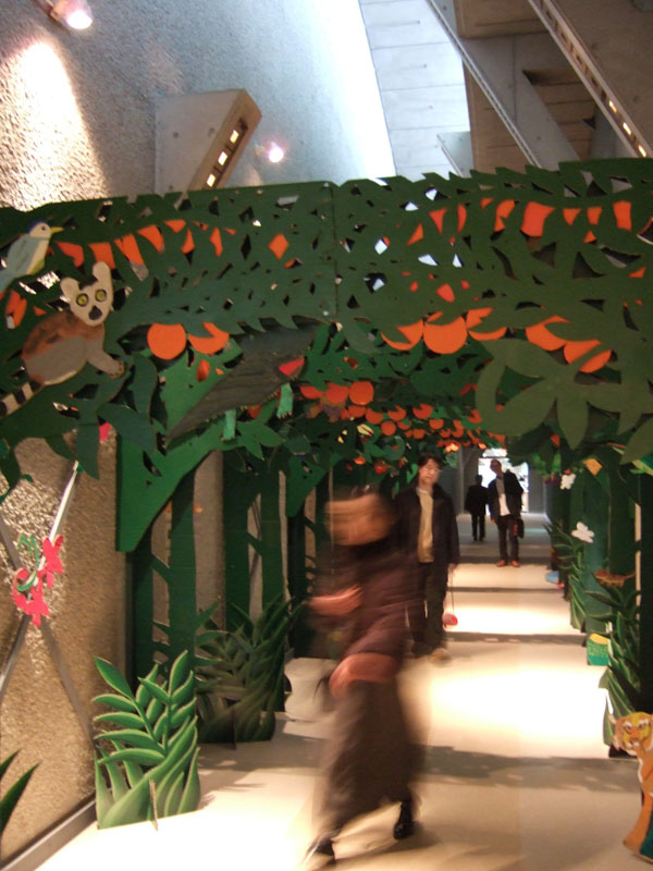 もう一つは、世田谷美術館のレストランに向う長い廊下に設けられた、子供たちがワークショップで作ったというルソーの『熱帯風景、オレンジの森の猿たち』のトンネル。猿の鳴き声まで聞えて、ワクワクさせるトンネル。