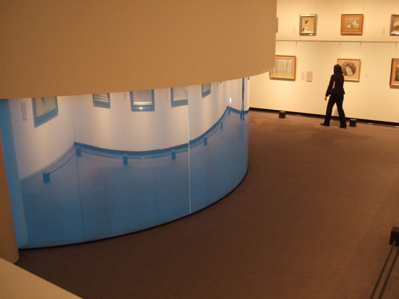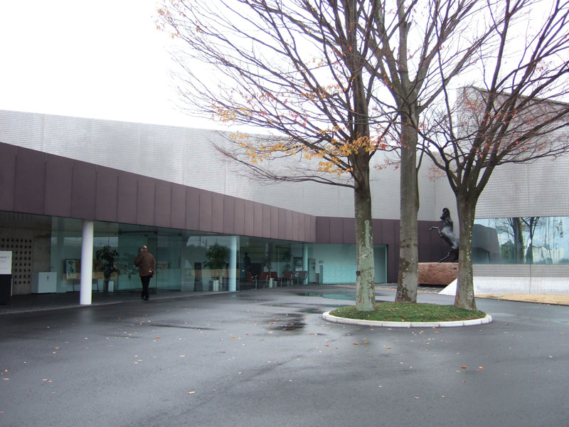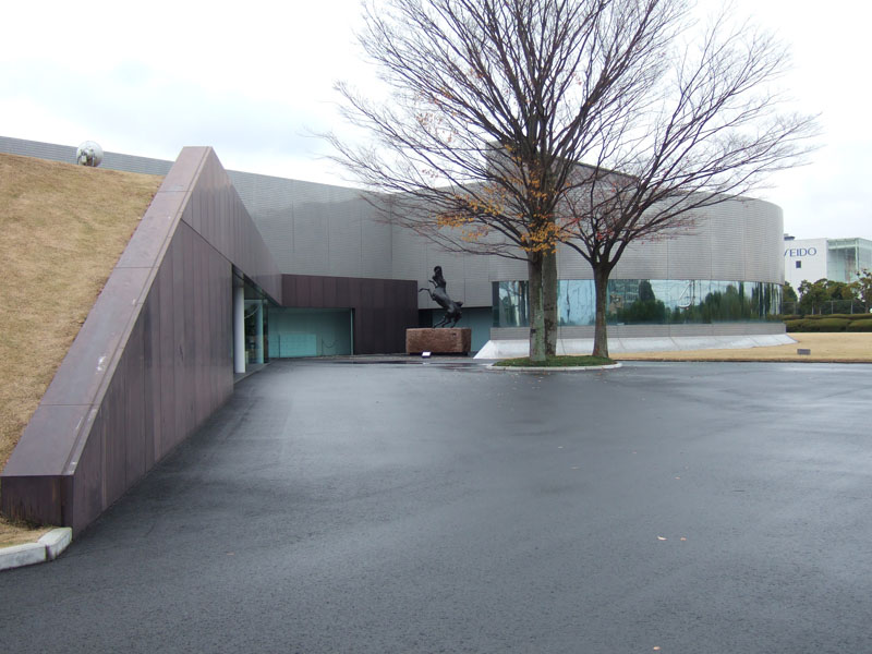 谷口吉生・高宮真介氏設計の資生堂アートハウスへ。MoMAと違って高さがグッと押さえられた建物。エントランスに伸びるアプローチを進み、中に入って7段くらいの階段をのぼると、ガラスの先に短く刈られた芝生が見える。左に進むと、巻貝のように時計回りにぐるっと回り込む絵画の展示空間がある。円になった中庭を囲んでいるガラスは、作品に気を遣ってのことだろうか、真上から差し込む日の光を遮るためのフィルムが貼られていて少し残念。片面ガラス張りの企画展スペースは、外からの光が足元に入り込む。今度は大きく時計回りに進むと、彫刻から工芸まで展示品が変わっていく。建物が弧を描いているので、先が見えない面白さがある。