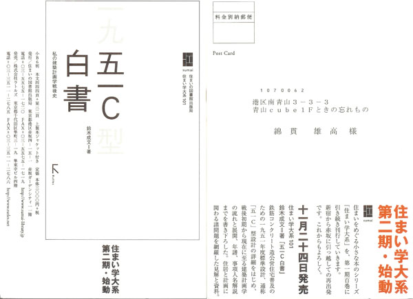 ときの忘れものも関わった100巻目の磯崎新「栖(すみか)十二」を刊行後、しばらくお休みしていましたが、このたび冬眠状態から覚め、第二期が始動。第101巻・鈴木成文「五一C白書 私の建築計画学戦後史」が刊行されました(3.000円+税)。
