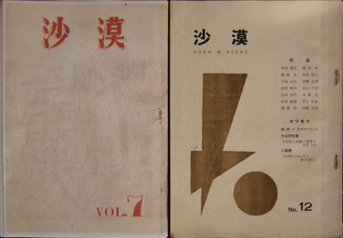 数日して小包が届いた。河野さんの著書と一緒に入っていた『沙漠』第7号にはたしかに私の「不審の街」という詩が載っているが、表紙の絵やタイトル・ロゴはまるで覚えていない。麻生久の巻頭の詩に続く場を与えられてもいるし、当然強烈な印象を受けたはずなのにその表紙を忘れ果てているとは。うろたえてしまった。しかもこの連載エッセイのなかでは『砂漠』と表記したが、じつは『沙漠』であることにも気がついた。「砂じゃなくて沙なんだ」と、当時同人の誰かが強調していたことを思い出してきた。今は表紙の絵にも記憶が戻りつつあるような気がする。大人たちのなかに混じって議論に耳を傾けていた、小さな画廊の様子まで見えてきたようでもある。記憶の蘇生はどこか痛ましい感情を伴っている。