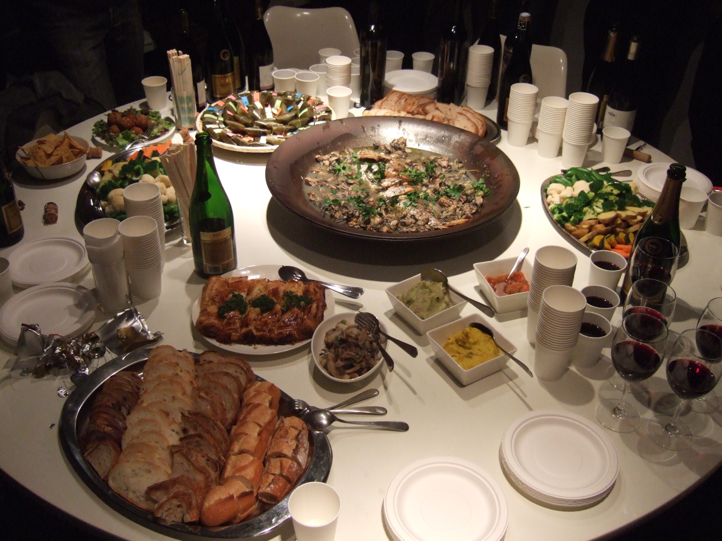 19時に磯崎アトリエのラウンジに綿貫さんたちと着くと、女性たちが慌しく準備していた。シェフもおり、スタッフも腕を揮って料理を披露するらしい。温野菜やパンに付けて食べるディップソース(かぼちゃ、アボガド、レバノン料理のものなど)や、鯛と牡蠣の料理、パイ、パエリアの米を麺に変えた通称“ポキポキパスタ?”などなど豪華絢爛。私も料理が上手だったら・・・。