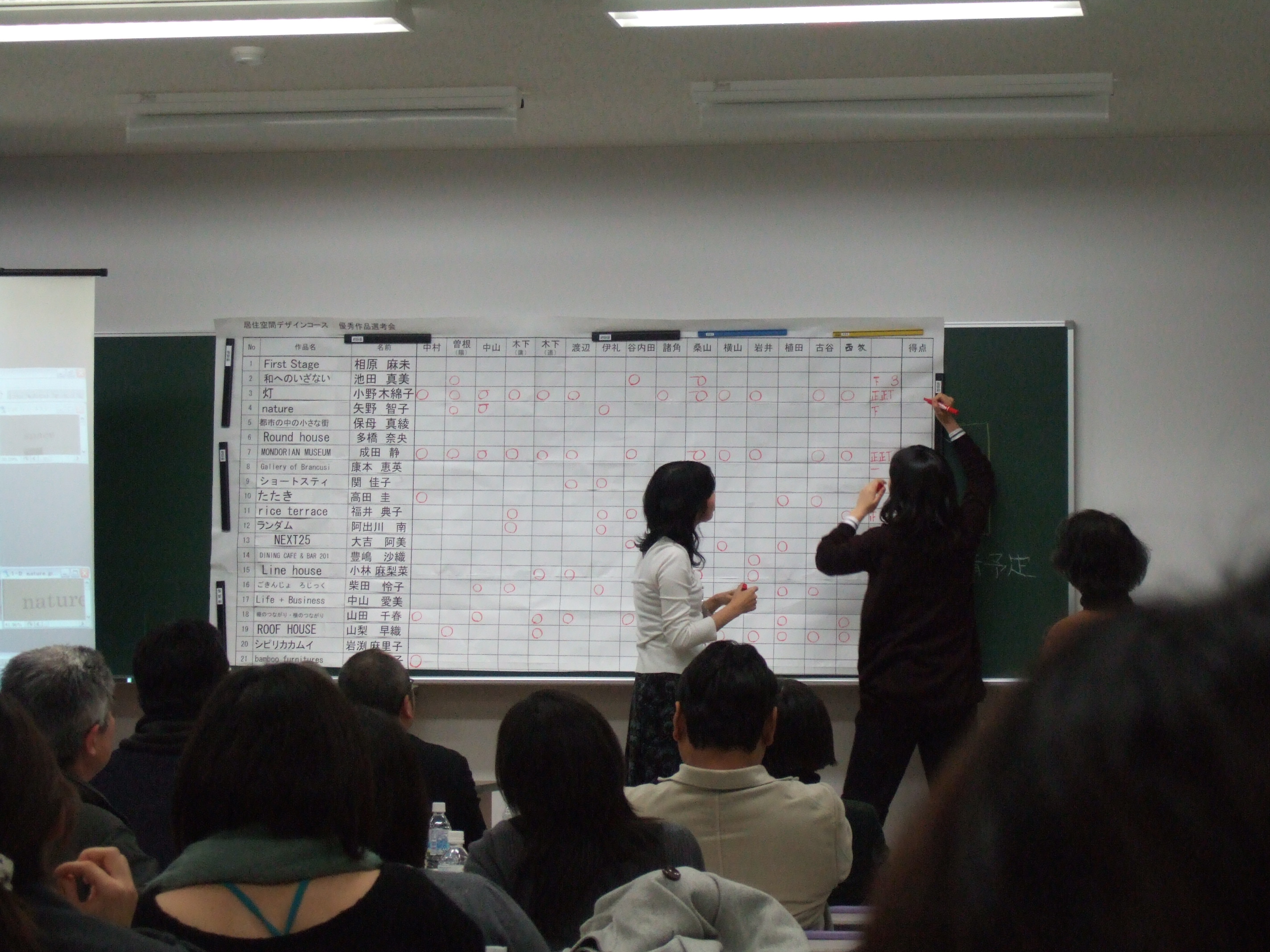 居住空間コースは女子のみ、一学年およそ30名。この「優秀作品選考会」は、全学年が設計の課題作品の中から一作品を選び、選考会で選ばれた作品のみプレゼンテーションを行なうというものらしい。