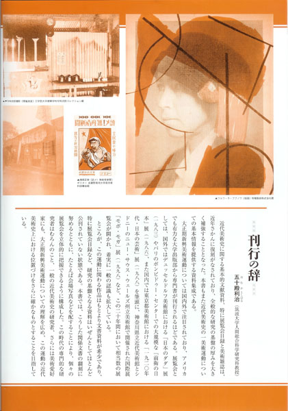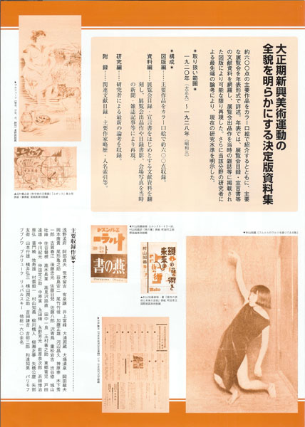 大正期新興美術運動の展覧会目録、宣言書などの600点に及ぶ文献資料をカラーで収録。