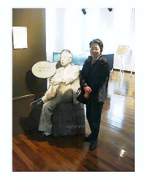 図書館の横の2号館にある花蹊記念資料館の小さな展示室の入り口に、おお久保先生が座っている! 久しぶりの恩師との再会です。