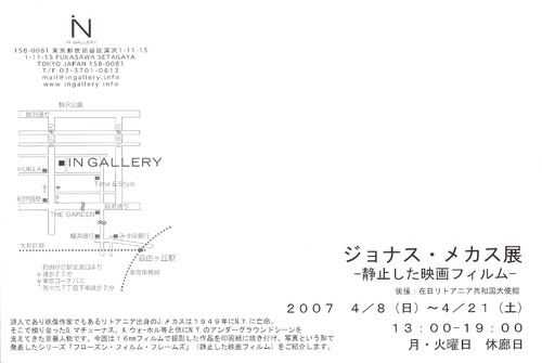 2007.4.19 新着作品・イベント情報 ジョナス・メカスの世界 ジョナス・メカス展 世田谷区深沢にあるIN GALLERYで、ジョナス・メカス展が開かれています。 会期は4月21日(土)まで。開廊時間は13時から19時までです。 最寄駅は自由が丘(東急東横線)、オーナーの邸宅の中に設けられた贅沢な空間で、メカスの写真作品と版画作品が展示されています。