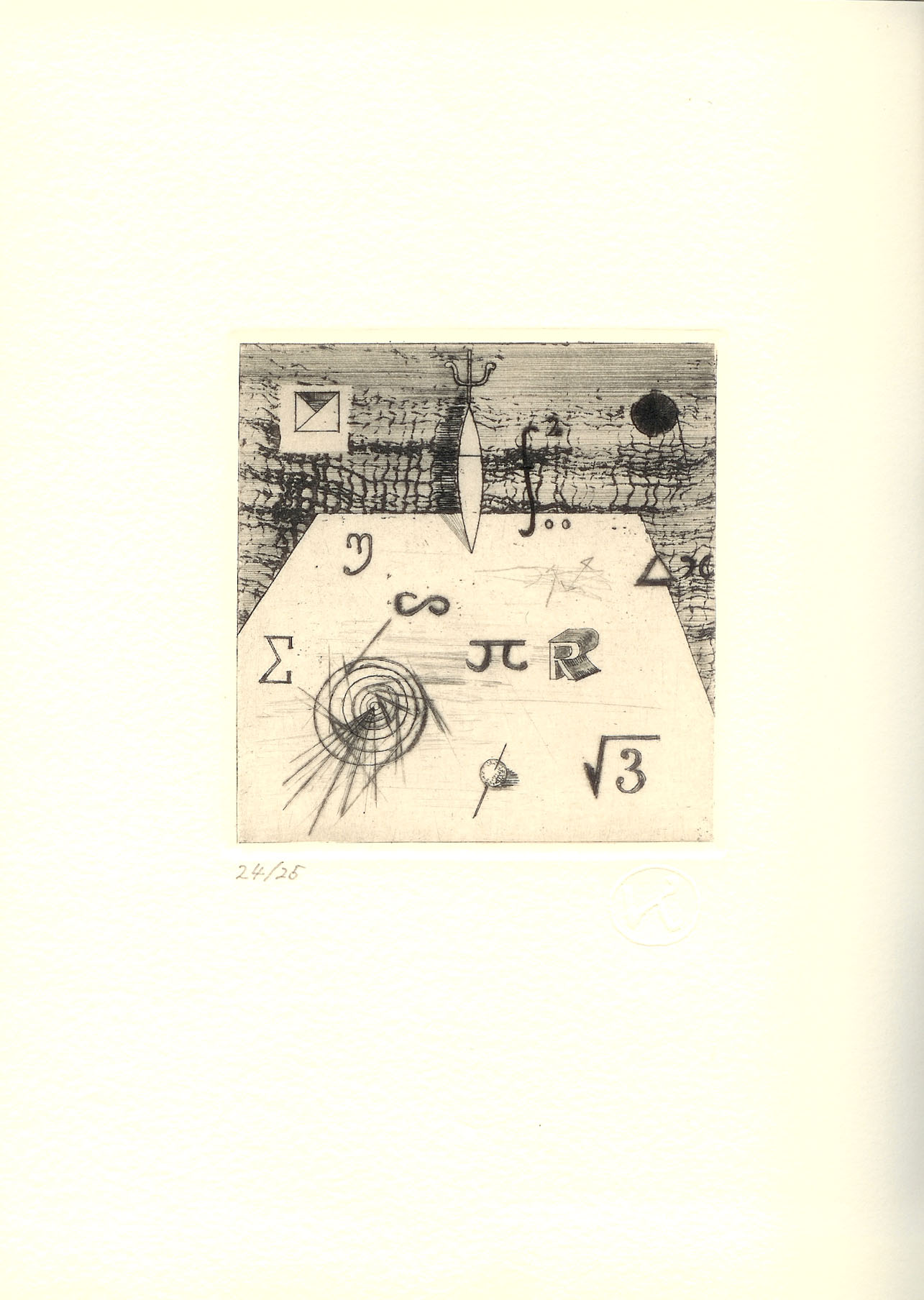 作品左下に鉛筆で<24/25>と限定部数が記入されており、右下には丸で<K>を囲んだエンボスが捺してあります。