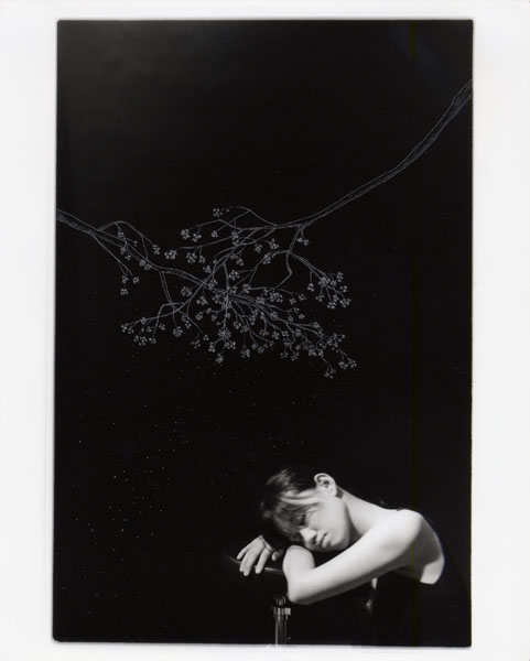 モノクロームのセルフポートレートの印画紙に、ピンで引っ掻いて様々な描き込みをした作品です。