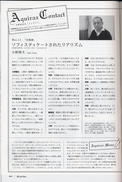 2007.7.28 画廊亭主の徒然なる日々 小野隆生VS宇野亜喜良 4月に開催した「小野隆生新作展」の折、来廊された画家の宇野亜喜良先生が小野先生の絵に興味をもたれて、画廊でインタビューをされました。 (写真右が宇野先生、左が小野先生) 雑誌「イラストレーション」9月号(No.167,玄光社)の宇野先生の連載コーナー<Aquirax Contact>に掲載されています。小野ファンの皆さん、ぜひ本屋さんで買ってください(1,600円)。 こちらの作品の見積り請求、在庫確認はこちらから