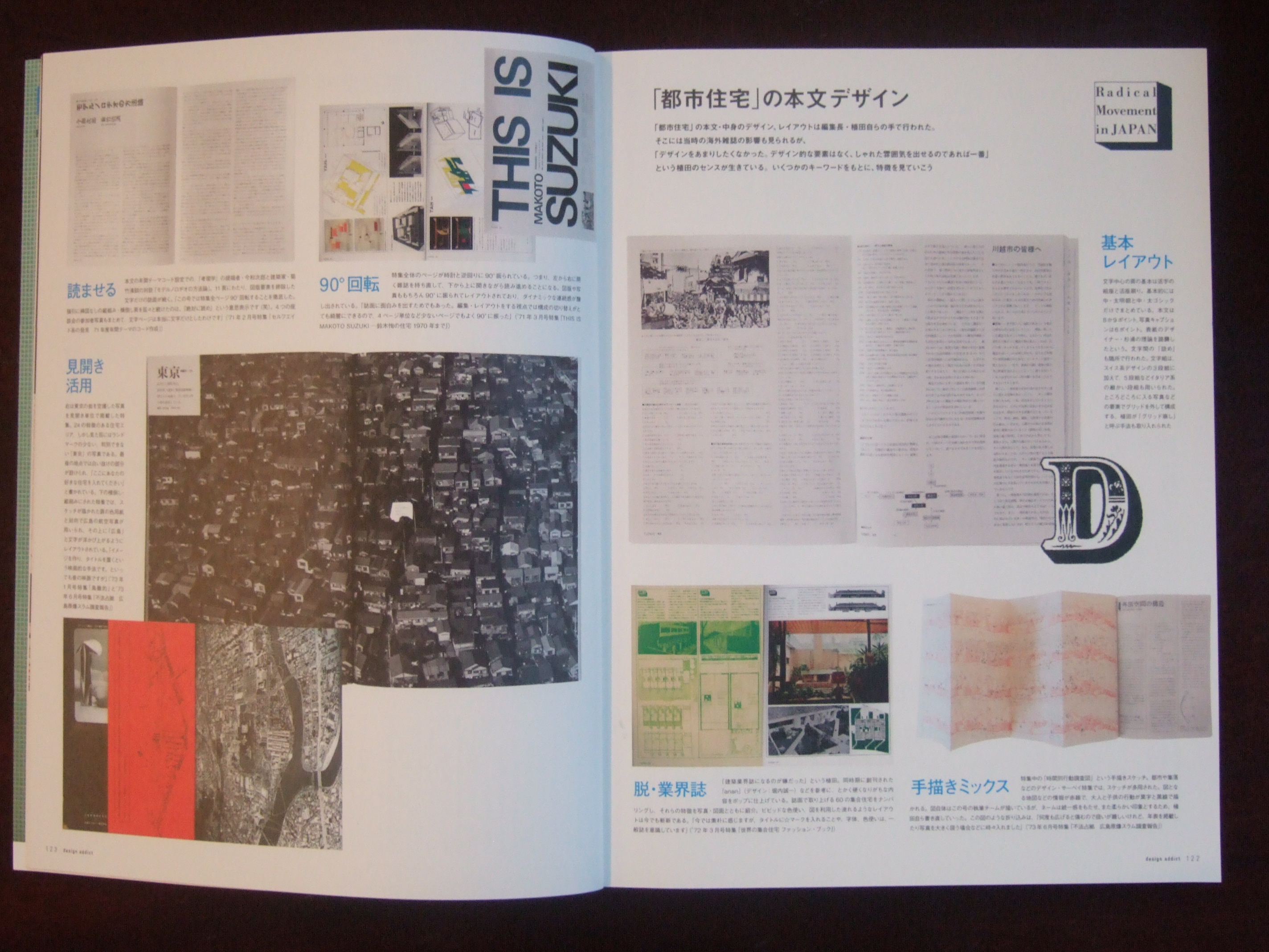 この記事に続いて「Radical Movement in JAPAN」として『都市住宅』が紹介されている。ここでは私のしゃべったことを再構成しながら、編集部で全体をいくつかの項に分けながらまとめている。当然表紙についての紹介もあるが本文レイアウトへの言及はこれまでもっとも詳しい。私もこのメディアの特性を意識して当時の『都市住宅』レイアウト戦略の一端を話したのだが分かりやすくまとめられているうえにデザイナー・松田行正さんの的確なコメントが付けられ、現在の雑誌デザインの問題意識につなげられている。