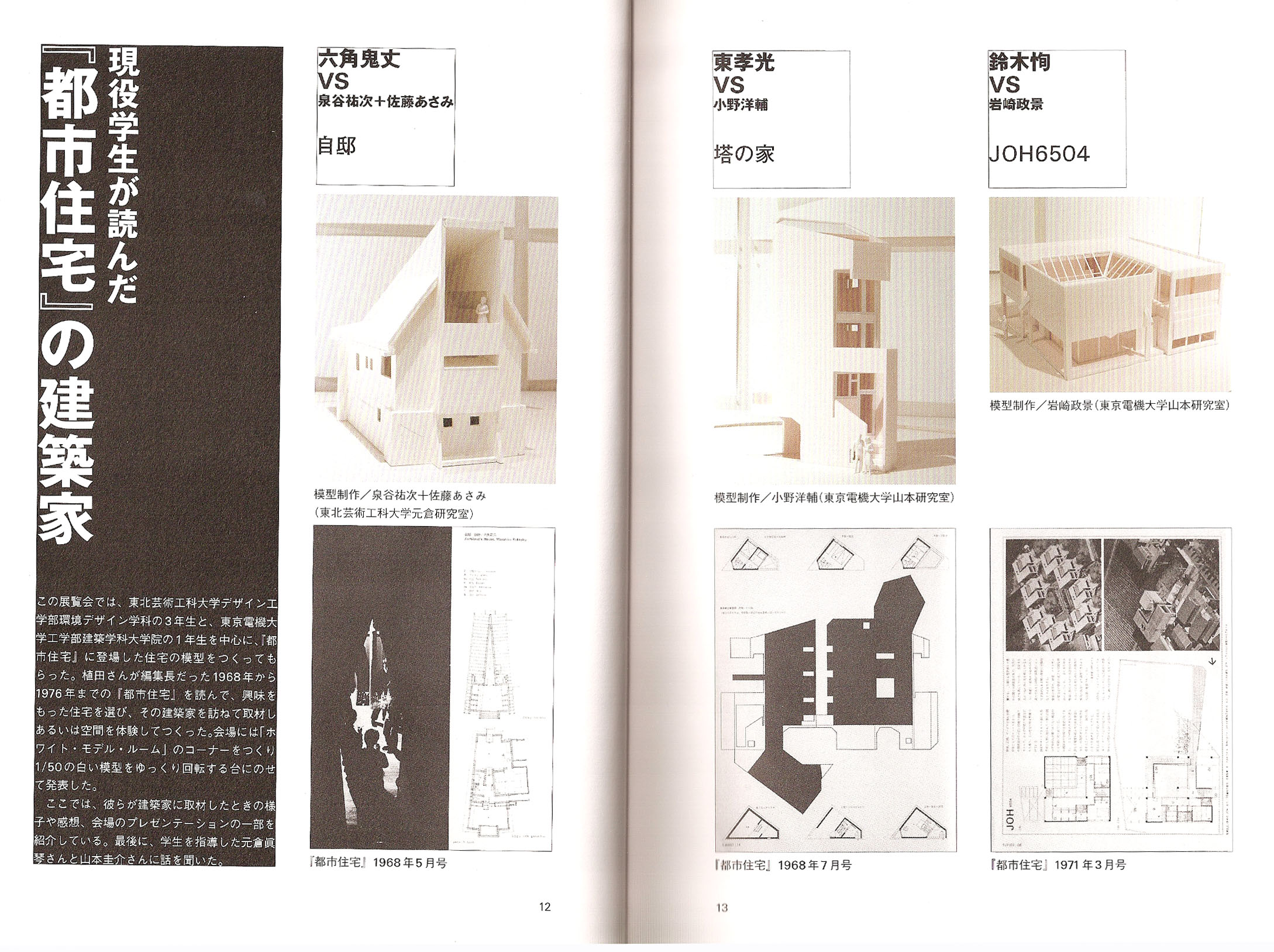展示は、私の関わった『都市住宅』(鹿島出版会 1968-76)全号とその後に企画・編集した単行本シリーズ「住まい学大系」第1期100巻をスタンドで展示し、それらの主な本文ページの拡大コピーを壁一面に張ったもの、さらには現役学生が当時の『都市住宅』を読んで興味を持った住宅作品10点を1/50の模型にしたもの、等々で構成(塚本由晴らによる展示デザイン)されているが、この様子が写真、図面、学生から建築家へのインタヴュー(これがおもしろい)などで本に再現されている。また花田の論文は130ページに及ぶ本格的な論考で、なかでも『都市住宅』については40ページをついやして詳細に論じている。『都市住宅』を知るには格好の資料で、当の私にとっても逆に教えられるところが多かった。