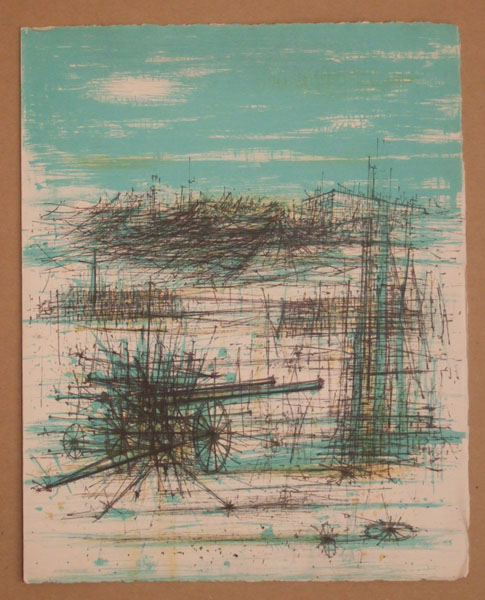 強い線で描かれた特徴のある作品で知られるカルズーのリトグラフです。1958年に刊行された「LAGUNE HERISSEE」という挿画本からの1点です。この作品でこのシリーズが終了いたしますので、作家のサインの入った奥付をお付けいたします。どうぞ奮ってご入札ください。