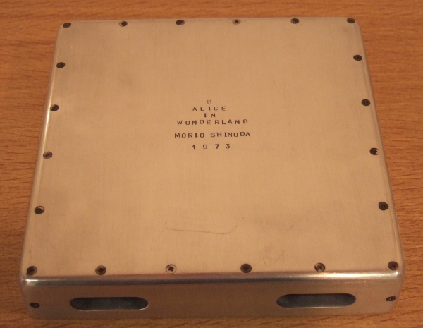 金属を素材に「テンションとコンプレッション」シリーズで、精緻な技術を駆使し、新しい人工的空間を表現し、物体の緊張関係を独自の造形思考の中で見事に造形化した。抽象的な形態を針金で宙に固定する篠田の緊張感溢れる彫刻作品が有名ですが、今回出品の「不思議の国のアリス」と名づけられた作品(マルチプルではなく、一点ものです)は、金属の箱の中を覗くと奇妙で不思議な空間が創造されています。