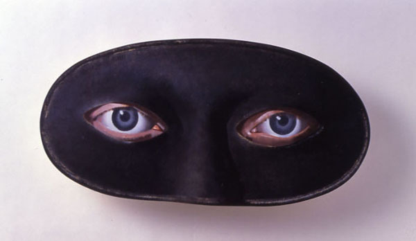 この絵の主人公は、どんな思いでいるのでしょうか。その目は何かを狙っているようにも見えます。「隠された危険な関係」という作品タイトルも意味ありげです。主人公は己の正体を隠そうとして、仮面と目を残して、他の身体全てを消し去ってしまったようです。そして最後には仮面さえも剥ぎ取り、「目」だけが残る・・・。「目」は、相手を見るためになくてはならないものだからです。