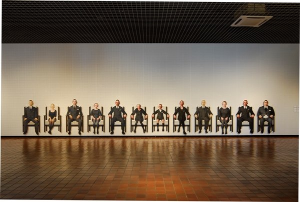 12人は、少年からおばあさんまで、性別も年令もまちまちです。まっすぐに正面を見据えた表情には、どこか緊張感さえ漂っています。そこには、家族が円卓を囲んで食事をするときに見せるなごやかな雰囲気は微塵も感じられません。12の家族の肖像の「断片」は、永遠に視線を交わすことなく、これからもこうして一列に並び続けていくように思えてならないのです。
