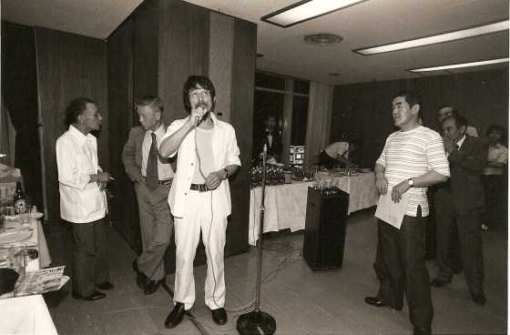 瑛九展のレセプション会場にて。左から、オノサト・トシノブ先生、久保貞次郎先生、マイクを握っている泉茂先生、瑛九の会事務局長の原田勇さん(今でもご健在で、先日の池田20世紀美術館の小野隆生展オープニングにも出席してくださいました)、右端の背広姿は瑛九の会代表の木水育男さん。