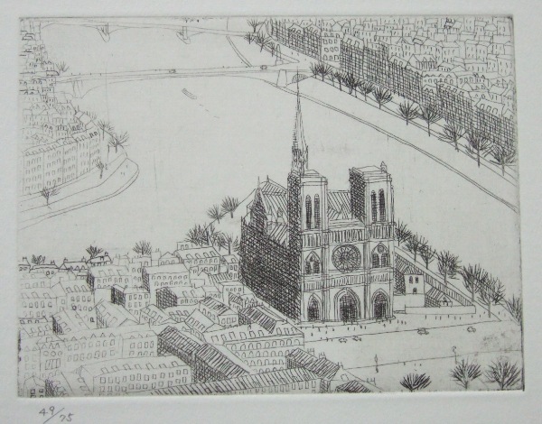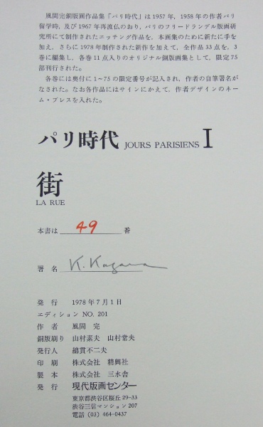 1978~1979年、私が現代版画センター時代にエディションした風間完銅版画集『パリ時代』全3巻は、1957年58年のパリ留学時、及び1967年の再渡仏の折、パリのフリードランデル版画研究所にて制作されたエッチング作品を、本画集のために新たに手を加え、さらに1978年に制作された新作3点を加えて全33点を全3巻に編集し、各巻11点組のオリジナル銅版画集として限定75部刊行したものです。