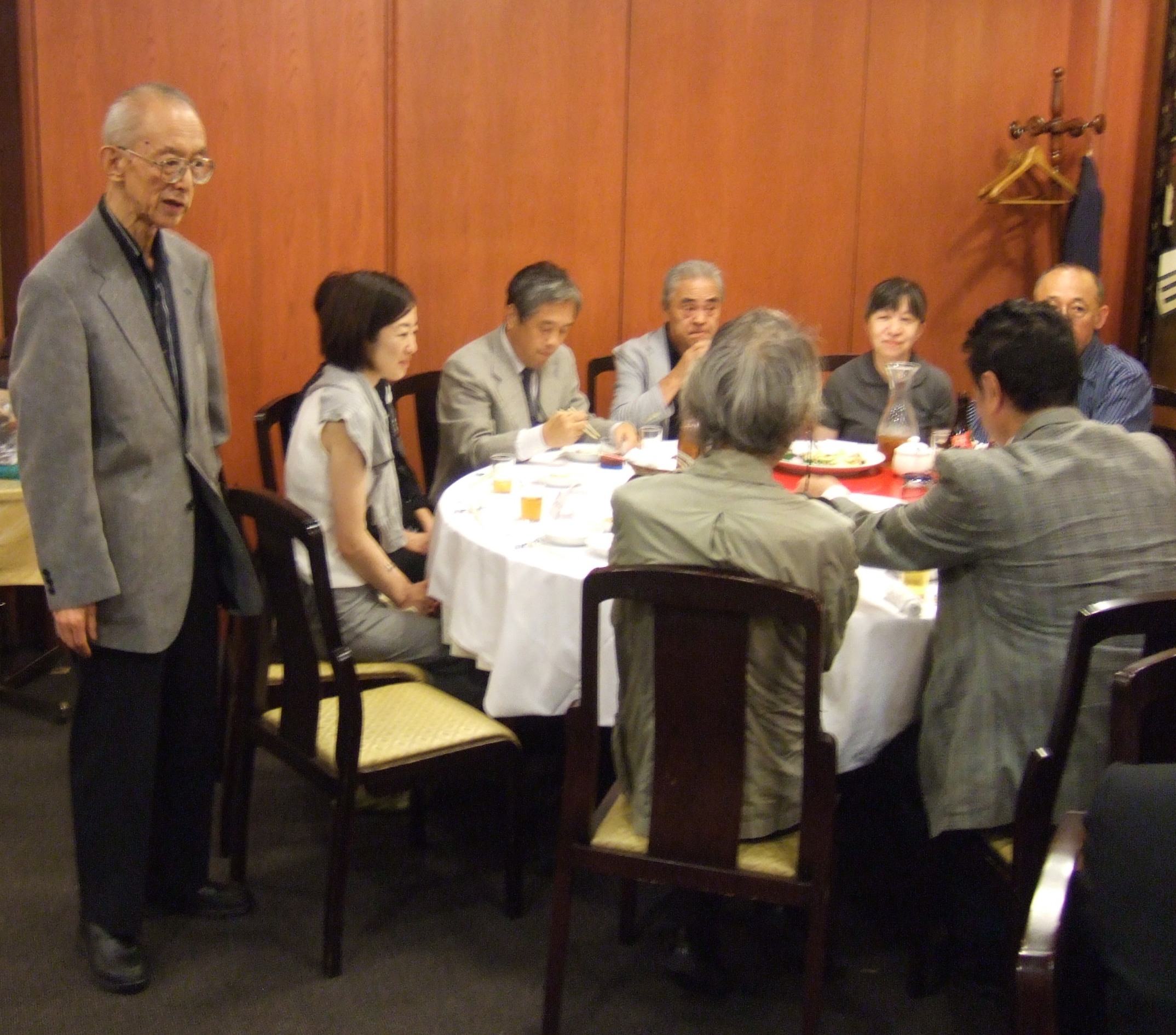 左)小野隆生先生を囲む会食でスピーチする美術評論家の瀬木慎一さん