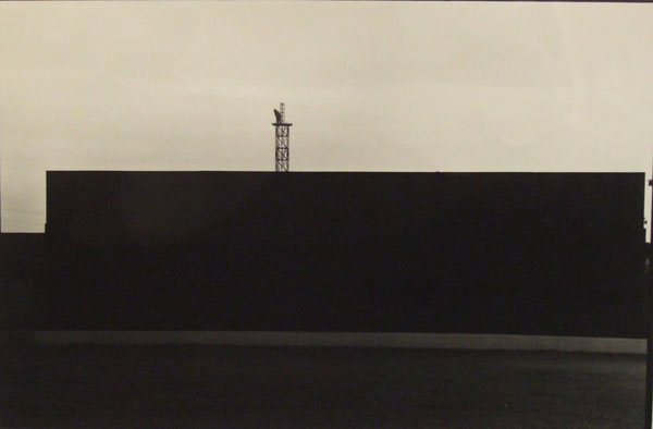 作品は、たそがれ時の野球のスコアボードを撮ったもので、画面の三分の一を真っ黒い四角が占めているという大胆な写真です。植田正治は、人物を画面の中心に立たせるなど、しばしばタブーとされるような構図の写真を撮りますが、この作品も陰影だけの表現で、何だかよく分からない真っ黒い四角を画面の中心に据えた写真という、一見植田正治らしくない作品のようで、実は、植田正治でないと撮らない写真であったりするのです。