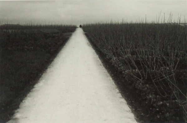 今日ご紹介する作品は、シリーズ「童暦」からの1点です。「童暦」は、1971年に中央公論社から「映像の現代」第3巻として出版された写真集のタイトルです。1955年頃から1970年頃までに撮影され、写真誌等で発表されてきた作品をまとめたもので、植田正治のフィールドである山陰の自然の中で子供たちの姿を四季を通して捉えたシリーズです。今日の作品は、その「冬」からの1枚です。畑の中の一本道、どなたも東山魁夷の1950年の作品「道」を連想されると思います。植田正治ももしかすると「道」を見ていたかもしれません。しかし、東山の道の両脇にあるのは青々とした夏草で、日差しさえ感じさせる一方、植田の道の両側は既に葉のなくなった桑畑で、まっすぐに伸びた白い道の彼方には、マントでも羽織っていそうな二つの影があり、寒風の冷たさを感じます。形は似ても、その印象はまるで異なる作品です。