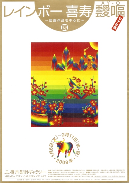 1931年生まれの靉嘔(本名・飯島孝雄)は、昨年喜寿を迎えました。1957年デモクラート美術協会が解散したのを機に、翌年渡米し、60年代半ばには前衛芸術家集団フルクサスのメンバーとして活動しました。絵画を構成する線・形・色から、現実に存在する「色」に着目し、人の目に映るすべての色を使って描くということから、このレインボーのシリーズは始まりました。その対象は、具象・抽象関係なく、あらゆるものをレインボーカラーで今もなお描き続けています。その作品からは、常に明るくユーモラスなポジティブさを感じることができます。