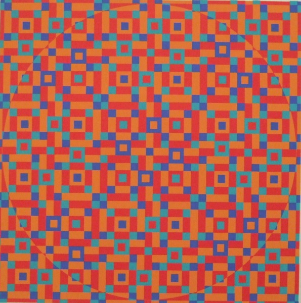 今日ご紹介する作品は、1967年に制作されたシルクスクリーン最初期のもので、この2点には一見すると「円」が見えませんが、よくみると小さな四角の組み合わせによる「円」が隠されています。さまざまな色の織り成すハーモニーがたいへん美しく響きあい、40年以上の時を経ていますが、発色も鮮やかで、オノサトファンの方には、ぜひコレクションに加えていただきたいお勧めの作品です。