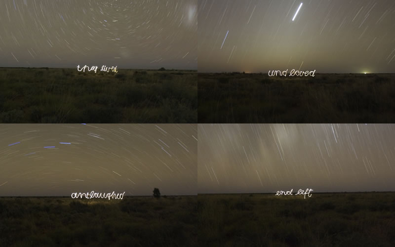 また、彼らのアート作品のひとつが"Light Works"という光を使った写真作品です。写真作品に光を使うのは当たりまえですが、その作品は、夜間、30分くらいシャッターを開放にして、オーストラリアなどの広い空間で、懐中電灯を使って線や文字を書くというものです。 幻想的な作品ではありますが、楽しんで作っていることが伝わってくるような作品でした。