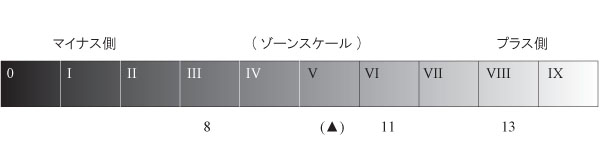 メーターを被写体に向け、仮につぶしたくない暗部がメーターにEV8と出たとしてそれをゾーンⅢに位置付けると中間部はゾーンⅤ~Ⅵ(EV10-11)となる。次に、必要な明部がEV13と出てそれがゾーンⅧを指していれば、つぶれない黒、飛ばない白、中間部を含め豊かなゾーンのプリントになることがその場で分かる。これがビジュアライズです。そのときに組み合った露出のキー(仮にISO100、絞りf8 1/15秒)で撮影すればバランスのとれたネガとなり、プリントも容易になる。つまり、被写体の重要な暗部はどこか、飛ばしたくない明部はどのくらいか、全体に印画紙の再現域の中にあるのか、もし印画紙の再現域を超えてしまう強い光なら柔らかな光になるまで待つか、そのまま撮影してフィルムの現像時間を減らせば(マイナス現像)よいこともその場で確認できるのです。