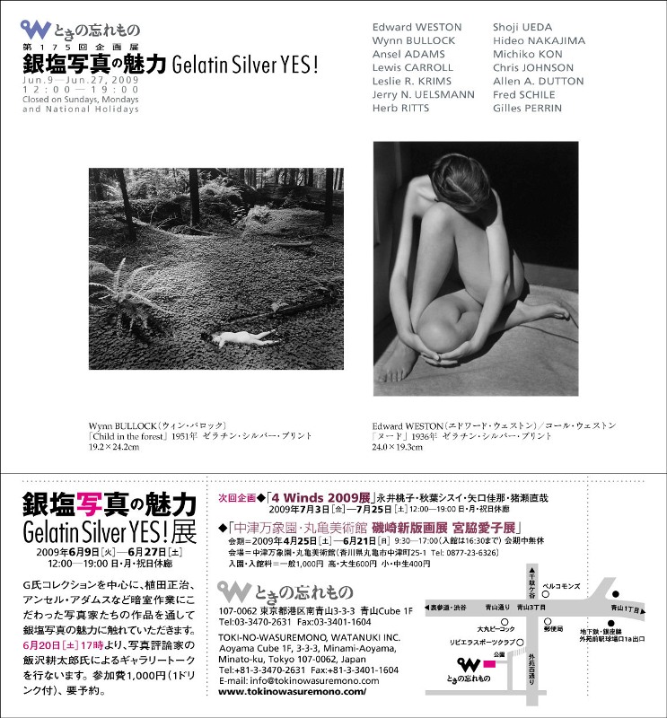 ◆ときの忘れものでは6月9日[火]―6月27日[土]「銀塩写真の魅力~Gelatin Silver YES! 」展を開催しています。ゾーン・システムを考案したアンセル・アダムス、それを現在日本で実践する中島秀雄、複数のネガを用いてひとつの画像を作り上げるジェリー・ユルズマンなど暗室作業にこだわった作家のほか、ウィン・バロックの代表作「森の中の子供」、エドワード・ウェストンの「ヌード(1936)」をはじめ、ルイス・キャロル、レスリー・R・クリムス、ハーブ・リッツ、植田正治、今道子、クリス・ジョンソン、安齊重男、アレン・ダットン、フレッド・シール、ジル・ペランの15作家の写真を展示しています。出品作品を収録したリーフレット(A5判、20頁、テキスト:中島秀雄)が完成しました。(@300円、送料120円、切手可)、メールにてお申し込みください。