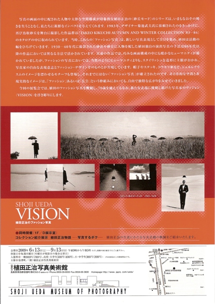 また、鳥取県の植田正治写真美術館では、「VISION 植田正治のファッション写真」と題した「砂丘モード」シリーズの展覧会が行われています。1983年長男の充氏からの提案で、デザイナー菊池武夫氏のカタログ写真を撮影します。これは、植田さんにとって初めての商業写真と言えるもので、このときのスタイリッシュな中にユーモアを交えた写真は、大きな反響を持って迎えられました。夏休みなどで山陰に行かれた際には、ぜひお立ち寄りください。
