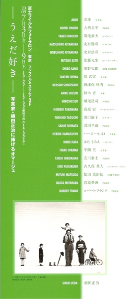 いま、六本木の東京ミッドタウンにある富士フィルムフォトサロンで「うえだ好き」と題した展覧会が開催されています。22名の写真家、デザイナー、俳優などの植田ファンやゆかりの人たちが、植田さんを撮影した写真や、植田作品へのオマージュを捧げた作品を出品しています。植田さん自身の作品も28点展示されていて、“うえだ好き”必見の展覧会です。7月9日(木)までと短い会期ですので、どうぞお見逃しのないよう。-うえだ好き-写真家・植田正治に捧げるオマージュ