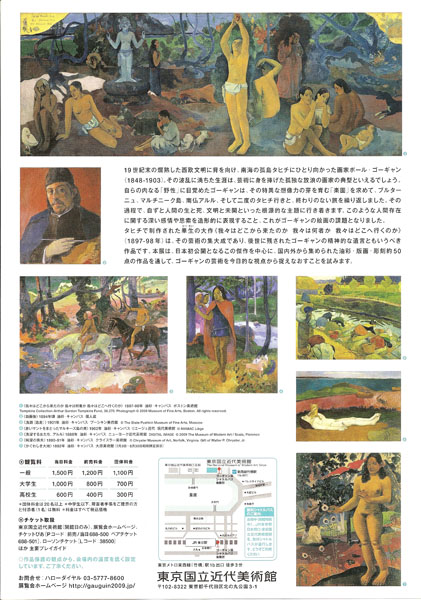 この展覧会は名古屋から巡回していますが、出品作品はかなり変わっているため、カタログも独自のものになっています。国内外の作品が集められていて見所は多々ありますが、その中でも大原美術館の「かぐわしき大地」は白眉でしょう。他にもタヒチ以前の作品では、国立西洋美術館の「海辺に立つブルターニュの少女たち」は魅力的であり、アルルで描かれた「洗濯する女たち」や「二人のブルターニュ女のいる風景」の大胆な構図、ゴーギャンの絵としては少し変わった感じのするタヒチ渡航直前に描かれた「純潔の喪失」など多様な作品を見ることが出来ます。