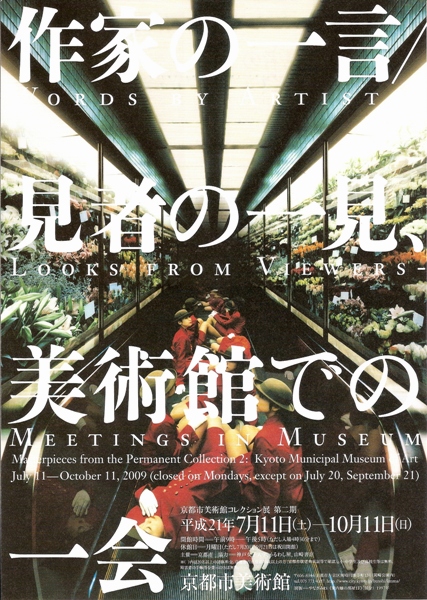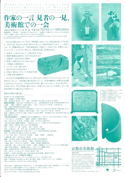 京都国立近代美術館の向かいには、京都市立美術館があります。そこでは10月11日(日)まで「作家の一言/見者の一見、美術館での一会」という収蔵作品のコレクション展が開催されています。出品されているのは、日本画、洋画のほか、彫刻、工芸などで、それ自体は、普通のコレクション展ですが、この展覧会の特徴は、作品のキャプションのところに問題が書いてあって、それをめくると答え、つまり、作家がこの作品でどういうことを表現したかったのかを理解するガイドが書いてあるのです。普通に壁に作品の説明を書くより、クイズ感覚で楽しむことが出来るというのがミソで、良い発案だと思いました。