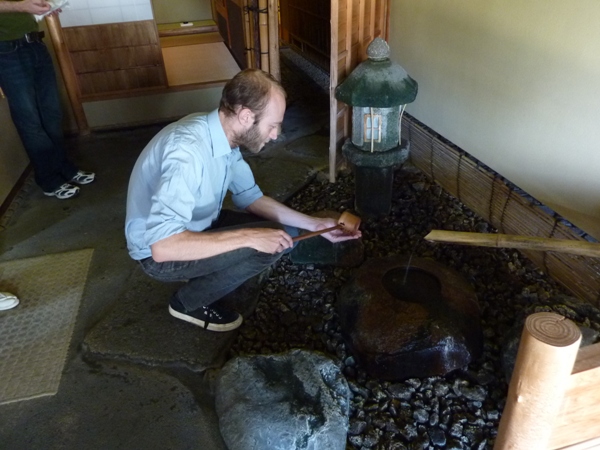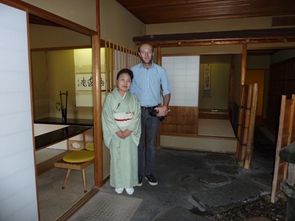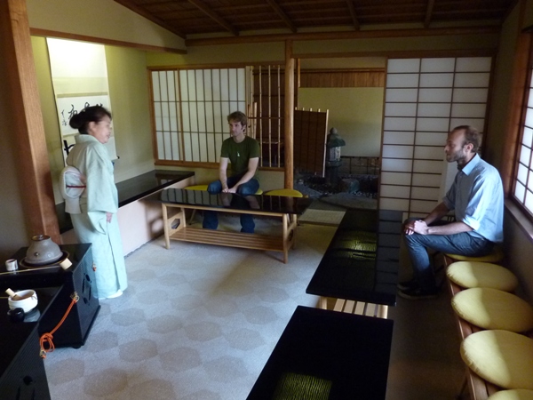 お手前のあと、畳敷きの茶室に移り、床の間や茶室自体の説明をうけ、緑茶をいただきました。セバスチャンさんもそちらこちらをカメラに収めて、興味津々でした。喜んでいただけたようです。