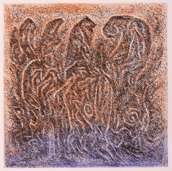 その3週間ほど前、私は先生の病床に通い、最後の銅版画「森の中の生物」に震える手でサインを書き入れていただきました。一度にはできず、一日に数枚づつのサインでした。辛い思い出ですが、それは旧友瑛九に寄せる難波田先生の強い思いから実現したものでした。