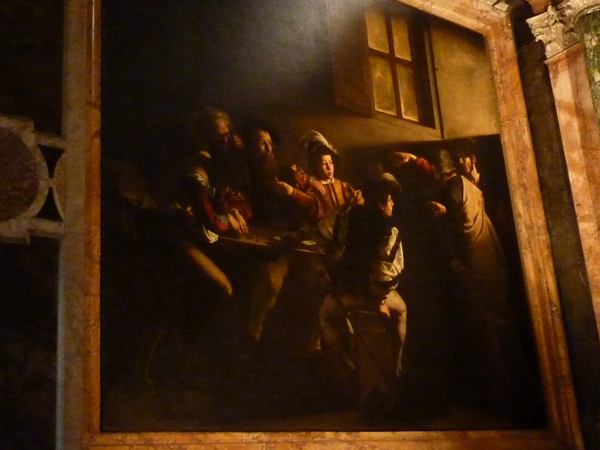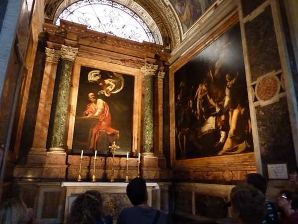 近くのサン・ルイージ・デイ・フランチェージ教会には、ひとつの礼拝堂の三方を囲んでカラヴァッジョの作品が配されています。それぞれ「聖マタイ伝」からの一場面で「聖マタイの召し出し」「聖マタイと天使」「聖マタイの殉教」という三部作になっており、どの作品も明暗を使って劇的な効果をあげています。