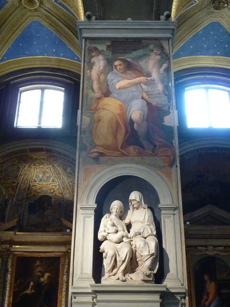 ここには、カラヴァッジョの「巡礼の聖母」という良く特徴の出た作品の他、ラファエロの描いた「預言者イザヤ」というフレスコ画が柱にあります。
