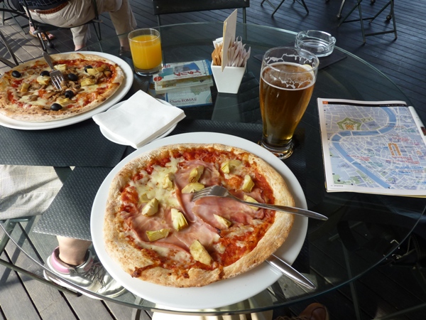 お昼に食べたアーティチョークとハムのピザと、テラスの眺めです。