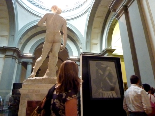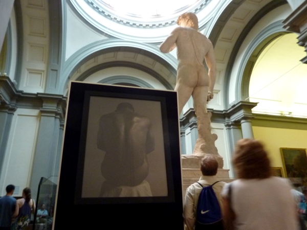 昼食後、アカデミア美術館へ。昨年もう一人の甥っ子と来た時には入りませんでした。と言うのは、数年前に入って、見たのはダヴィデ像くらいで、他は大したことのないような記憶あでったのですが、今回それは大きな間違いであったことを認識いたしました。また、今回ここでアメリカの写真家・ロバート・メイプルソープの写真展を開催していました。メイプルソープは、1989年エイズで亡くなった写真家で、ひじょうに美しく厳しい構図の花やヌード、彫刻の写真を撮るとともに、性的に過激な作品もあり、常に賛否を分ける作家として知られています。そのような写真家の作品をアカデミア美術館で展示するというのは、かなり意外な気もしました。しかし、その疑問は展示室に入るとすぐに解消されました。居並ぶミケランジェロの作品の横にメイプルソープの作品が展示されていて、相互に共通する美意識のようなものを見ることが出来ます。特別展示室には、メイプルソープの作品とともにミケランジェロのデッサンやマン・レイのオブジェなどが配され、ここアカデミア美術館ならではの展示になっていました。ただ、ここに来ている人たちのほとんどは、ダヴィデ像を始めとするミケランジェロの作品を見に来ているので、写真に目を留める人は多くなく、残念でした。