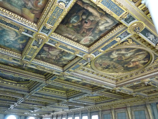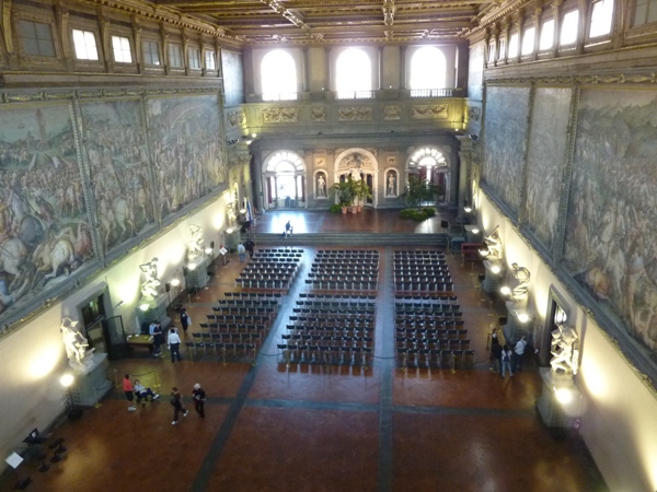 次に、ヴェッキオ宮を見学。五百人広間と呼ばれる大きな会議場は壁や天井を絵に囲まれていて、これもまた圧倒的です。700年前に建てられ、かつてはフィレンツェ共和国政庁舎であったこの建物は、こうしてランドマークとして残され、今でも市庁舎として使われているというのがヨーロッパの懐の深さです。
