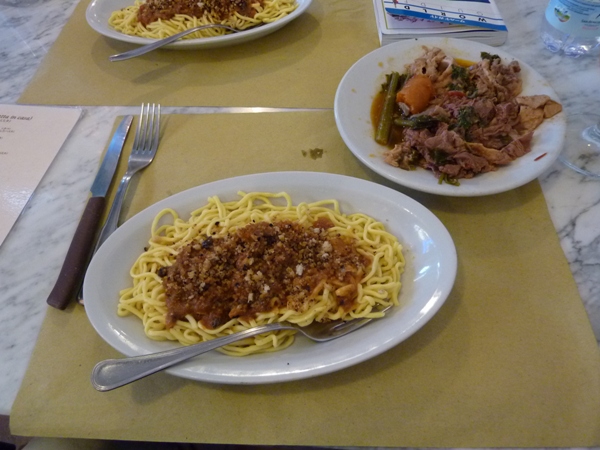 ランチは、イタリア唯一だというラーメン屋に行ったのですが、夜しかやっておらず、仕方なく、昨日の中央市場に行って、別の店に入りました。甥っ子がパスタを食べたいというので来たのですが、出てきたのは、チンして持って来ましたというような、縮れたラーメンのようなパスタでした。まあ、これはこれでいいか、といただきました。
