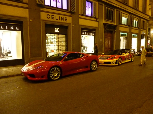 フィレンツェには、こんなすごい車が路上駐車されています。というのは嘘で、昼間、この道に赤絨毯が敷かれその上に展示されていた車です。この前に大きなトレーラーがいて、積み込まれるのを待っているところです。