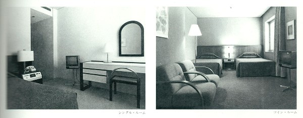 当時の雑誌『新建築』1983年11月号には、竣工当初の「筑波第一ホテル」の客室が紹介されており、上の「ライティングデスク」「鏡」などが掲載されています。