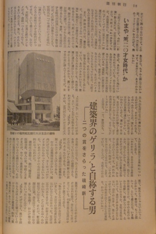 「おどり出た二人の異才」と題された取材記事では、小説家大庭みな子氏と共に「“建築界のゲリラ”と自称する男」と磯崎さんが大々的に取り上げられています。本文では、建築学会賞を受けた大分県立図書館を中心とする作品群を取り巻くエピソードを柱にして、八田利也・ミラノトリエンナーレ・モンロー定規などについて語られている。中でも「アトリエの壁に反戦ポスター」の見出しには絶句!ハプニングなどの前衛藝術やチェ・ゲバラの思想に傾倒する当時の磯崎さんのライフスタイルに深く切り込んだ資料価値の高い1冊。