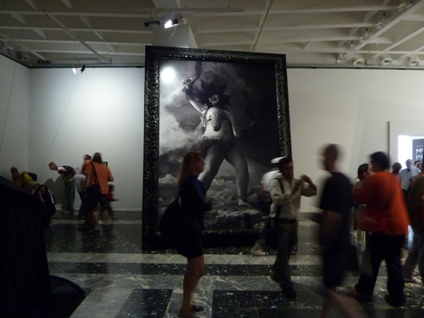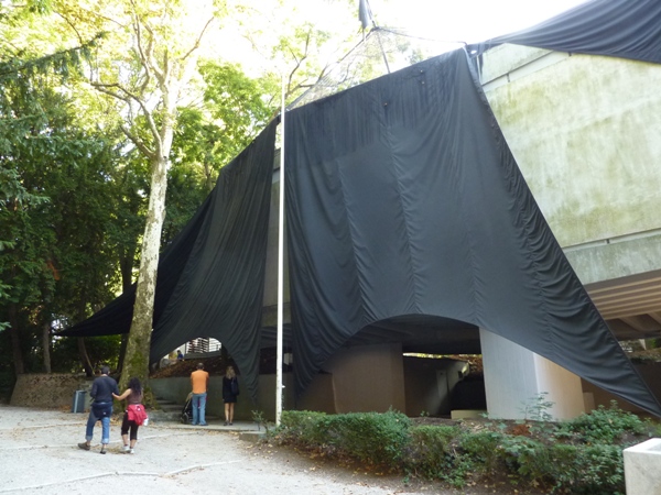 日本館は、それ自体が黒いテントで覆われていてやなぎみわさんによる作品が展示されていました。「老少女劇団」と題された、若い女性が老女となったときの姿を5つの巨大な写真作品は、見るものを圧倒する迫力がありました。会場内の小さなテントの中では映像作品を見ることもできます。ただ実は、もっと大きな建物かと思っていたので、その狭さには少々の失望感を禁じ得ませんでした。