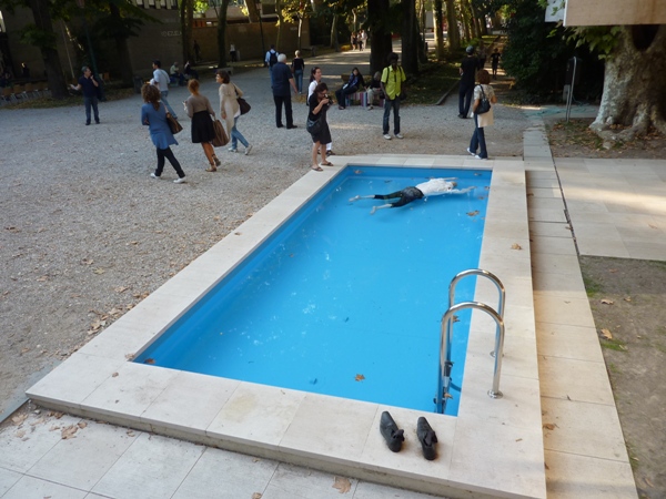 点在する各国のパビリオンを巡るのは、なかなか楽しい経験でした。ロシア館のブラックライトの部屋やオーストラリア館の映像作品など、アートと言うよりアミューズメントパークのようで年齢を問わず楽しめそうに思いました。なかでも、「The Collectors」と題されたデンマークとノルディック三国の展示では、パビリオンに「For Sale」という看板が立てられ、建物の前のプールには、コレクターの溺死体が浮いている。しかしそれはどちらかというとコミカルで、その死体を子供がつついたりして楽しんでいるのでした。
