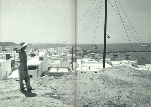 次頁の「エーゲ海、ミコノス島での磯崎新。わたしの方はこれがはじめての海外旅行。1972年」も同様です。この写真が「おもしろい」のは、単に左端に写っている上半身裸でサンダル履きの人物が磯崎新だからではありません。もちろんそれが分かれば一層興味深い写真となることを否定はしません。けれども、そんなことが分からなくてもこの写真は十二分に魅力的です。画面左から右に、小高い丘のざらりとした地面、石膏で型取りされたような家の屋根とスチレンボードで作られたようなミコノス島の町並み、きらきらというよりはむしろもったりとしたエーゲ海、そこにすっと伸びる岸壁と桟橋、ホリゾントを垂らしたように見える空が手前から段々に重ねられ不思議なリズムが刻まれ、それをすっぱり断ち切るかのように黒々とした電柱が二本突き立っています。左端の人物に相対するように屹立した電柱の中程に取り付けられた街灯のシンバルのような丸いシェードが、人物のかぶっている広幅の丸い帽子の鍔、さらにそれを地面に移した丸い影と響き合い、電柱から傘の骨のように下に向かって四方八方に伸びる電線の作る三角形が、人物が右手に吊しているカメラのストラップが作るトライアングル、さらにはニコンFのかのプリズムケースの三角錘と共鳴しています。かのアンリ・カルティエ=ブレッソンの傑作「サン=ラザール駅裏」を彷彿とさせる(?)、一瞬にして考え抜かれた見事な構図です。そして、その上で、一本の柱が建築の始まりであるという説を頭に入れ、ここが、ギリシャのミコノス島であることを確認し、その一本の柱に敢然と相対峙しているのが磯崎新ということになって、そこで二重三重に「おお」と言うことになるのではないかと思うのです。さらに、その立ち姿がミケランジェロの「ダビデ像」を思わせるといったら、これはさすがに言い過ぎですね。