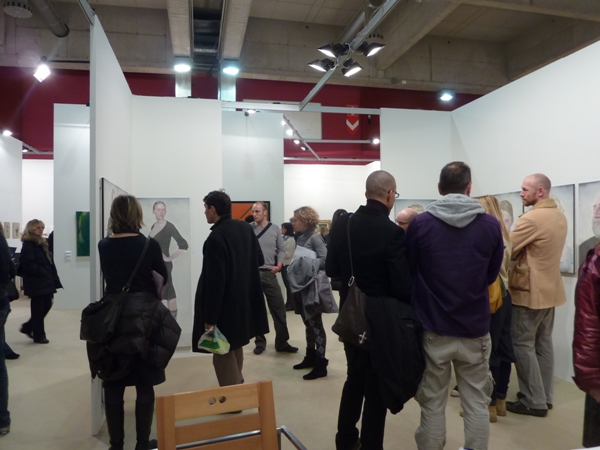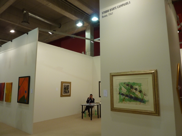 今回、写真を専門に扱っている画廊もいくつか出展していて、ナン・ゴールディンの作品をメインに展示しているところがあったので、価格を尋ねたところ、「うちは画廊ではなくて美術館なのです。」との答えで、ボルツァーノにある美術館が宣伝で出しているブースでした。また、コンテンポラリーだけでなく、デ・キリコの作品やミロの作品も少数ですがあります。ローマの画廊我々の前のローマから来ている画廊は、デ・キリコ、サム・フランシス、エンゾ・クッキなど数点の絵画をこちらの倍はあろうかというブースに1面に1点ずつ飾っています。そして、ここのオーナーは、決して耳から携帯電話を離すことなく話し続けています。目の前にはお客さんはいないようです。この人に限らず、個性的な画廊のオーナーがそこらじゅうにいて、彼らと話をするだけでも、結構楽しめます。