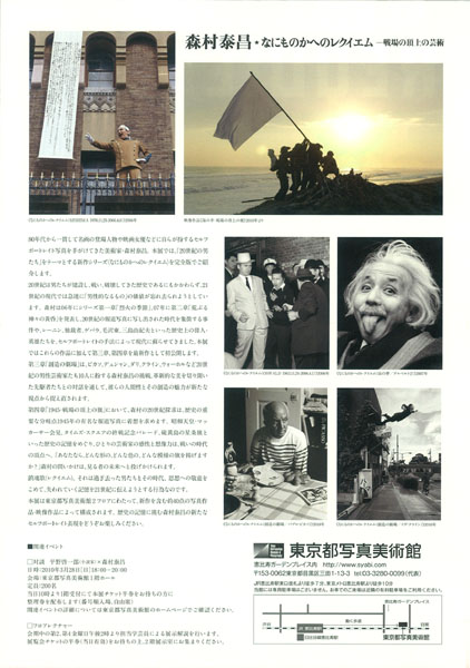 「美術史の娘」では絵画の中の登場人物に扮し、「女優」シリーズでは、さまざまな女優に扮したセルフポートレイトを発表してきた森村氏が、この展覧会では、歴史上の人物、三島由紀夫、ピカソ、ヒトラー、アインシュタインらへのレクイエムとして制作した写真、映像作品を展示しています。